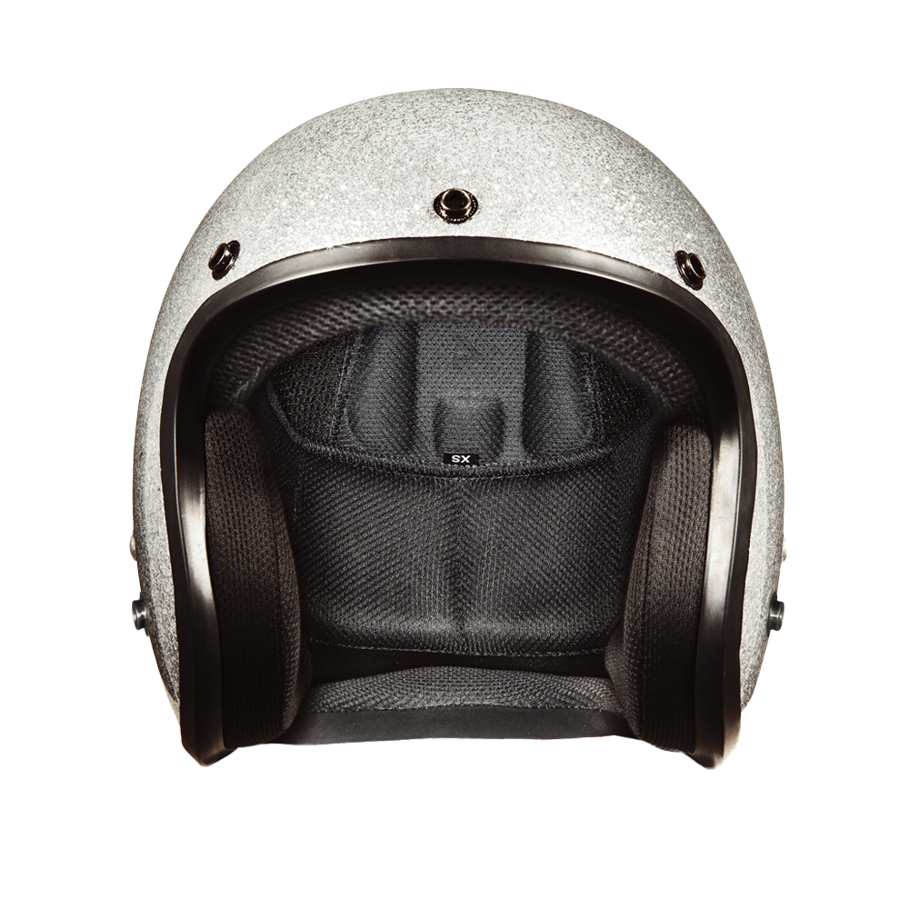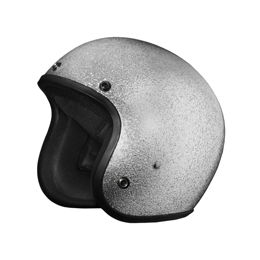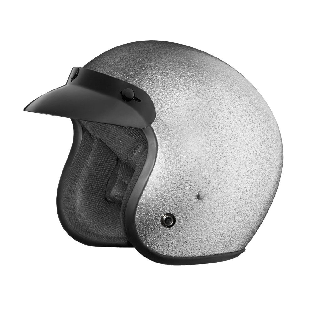 Our D.O.T. Daytona Cruiser 3/4 Shell Helmet In The Silver Metal Flake, Meets And Exceeds D.O.T. FMVSS 218 Standards And Is The Smallest D.O.T. 3/4 Shell Helmet Ever Made!! With 3 Different Shell Sizes, You’re Sure To Get That Proportionate Fit!! Available Only With Removable, Snap On Gloss Black Bubble Visor. Many More Colors And Designs Available Such As Soft Touch Dull Black, Hi-Gloss Black And Hi-Gloss White; Custom Colors: Gun Metal Grey Metallic; Specialty Items: Graphics. Head Wrap And Cloth Draw String Bag Included. Sizes Range From XS-2XL.