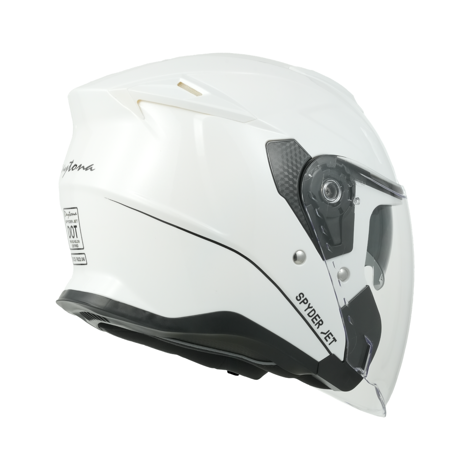 Our D.O.T. And ECE Daytona Spyder Jet Helmet In The Hi-Gloss White Finish, Meets And Exceeds D.O.T. FMVSS 218 And ECE 22R06 Standards!! Features A Dual Shield System; Outer Anti-Scratch Clear Shield And Inner Anti-Scratch Retractable Smoke Shield. Also Has A Quick Release Lock Retention System; One Finger Release Lever For Easy Detachment And A Removable, Hand Washable Interior (Moisture Wicking Fabric). Bluetooth Compatible. Cloth Draw String Bag Included. Sizes Range From XS-2XL.
