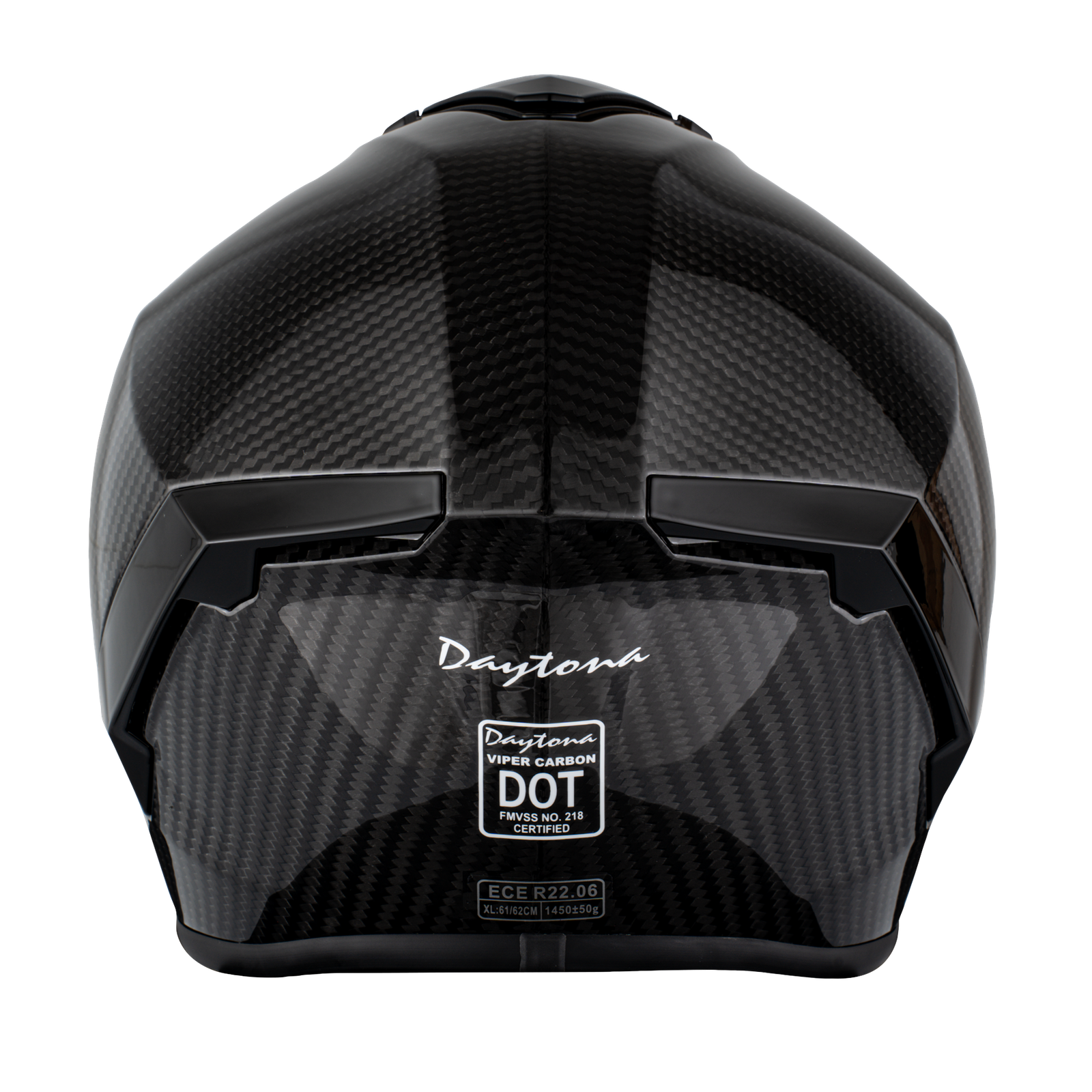 Our D.O.T. And ECE Daytona Viper Helmet, With Inner Anti-Scratch Retractable Smoke Shield, In Grey Carbon Fiber, Meets And Exceeds D.O.T. FMVSS 218 And ECE 22R06 Standards. With 2 Different Shell Sizes, You’re Sure To Get That Proportionate Fit!! Features A Dual Shield System; Outer Anti-Scratch Clear Shield With Pinlock 120 Lens (Anti-Fog) And Inner Anti-Scratch Retractable Smoke Shield. Also Has A Quick Release Lock Retention System; One Finger Release Lever For Easy Detachment, Passive Chin And Forehead Ventilation, And A Removable, Hand Washable Interior (Moisture Wicking Fabric). Bluetooth Compatible. Cloth Draw String Bag Included. Sizes Range From XS-2XL.